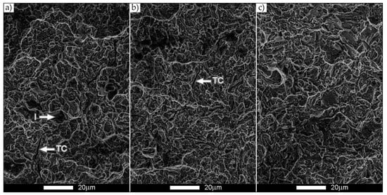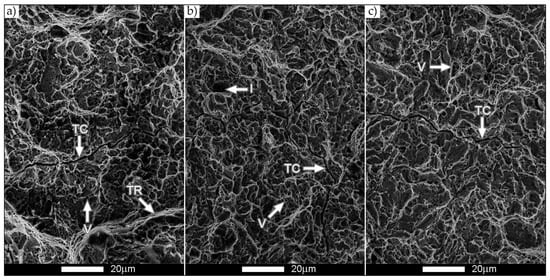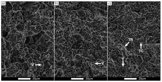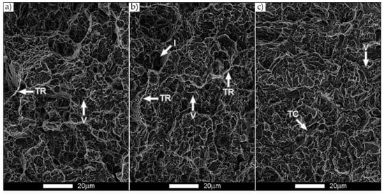 Images of the Hardox Extreme steel fracture surface in delivery state shown in Figure 9: longitudinal orientation (+20 °C). (a) The area marked with the A1 frame. (b) The area marked with the B1 frame. (c) The area marked with the C1 frame. TR—tear ridges, V—microvoids, I—inclusions, voids left after debonded inclusions, TC—transversal cracks. SEM, non-etched state.