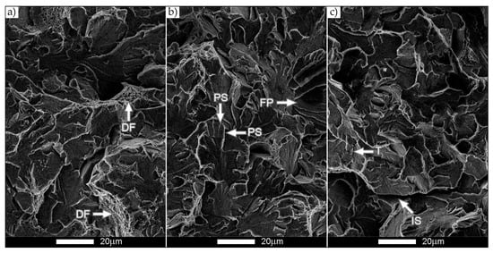 Images of the Hardox Extreme steel fracture surface in normalized state shown in Figure 10: longitudinal orientation (+20 °C). (a) The area marked with the A1 frame. (b) The area marked with the B1 frame. (c) The area marked with the C1 frame. DF—ductile fracture, PS—parallel steps, FP—fan pattern, T—tongues, IS—intergranular steps. SEM, non-etched state.