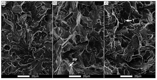 Images of the Hardox Extreme steel fracture surface in normalized state shown in Figure 10: longitudinal orientation (−40 °C). (a) The area marked with the A1 frame. (b) The area marked with the B1 frame. (c) The area marked with the C1 frame. FP—fan pattern, T—tongues. SEM, non-etched state.