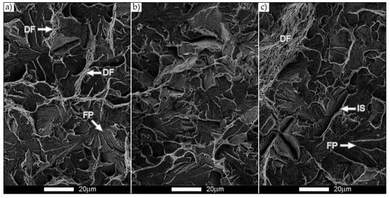 Images of the Hardox Extreme steel fracture surface in normalized state shown in Figure 10: transverse orientation (+20 °C). (a) The area marked with the A1 frame. (b) The area marked with the B1 frame. (c) The area marked with the C1 frame. DF—ductile fracture, FP—fan pattern, IS—intergranular steps. SEM, non-etched state.
