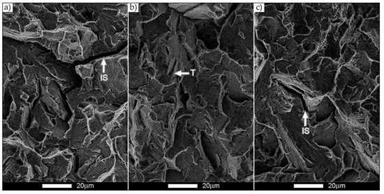 The microscopic analysis (SEM) of fractures revealed the details and characteristic features in their structure. In the delivery state, for all samples (Figure 11, Figure 12, Figure 13 and Figure 14), even those which underwent the impact strength test at the lowest temperature, the fracture classified as a quasi-tear was obtained. Its characteristic features are extensive topography, transverse cracks—visible especially in Figure 11c, Figure 12c and Figure 13a–Figure 14b—and voids left after the carbide phases are separated from the matrix (Figure 11, Figure 12 and Figure 13). Apart from the places left by small carbide phases, there were also large voids probably left by non-metallic inclusions (Figure 11b and Figure 13b). The quasi-brittle fracture occurs as a result of brittle cracking in small, local areas, followed by combining them together into one crack surface due to plastic deformation. Facets are small and partly plastically deformed. Although the facets are similar to brittle facets, owing to the occurrence of “river” sculpting, the identification of crystallographic surfaces, along which the cracking process takes place, is practically impossible. The meandering “river” system creates voids, whose structure resembles a ductile fracture, on a large surface [17,19]. The ridges of quasi-brittle facets, which create a system of elevations and voids, are typical ductile surfaces. A change of the character of this fracture can be described exactly on basis of the participation of and ductile ridges. Their participation in the fracture surface decreased with reducing the test temperature (Figure 12 and Figure 14). The quasi-brittle fracture is a typical fracture, observed earlier in martensitic steels [20,21]. Thus, the low impact strength in the delivered state was the effect of the lack of plastic zones below the mechanical notch and in sample side zones.