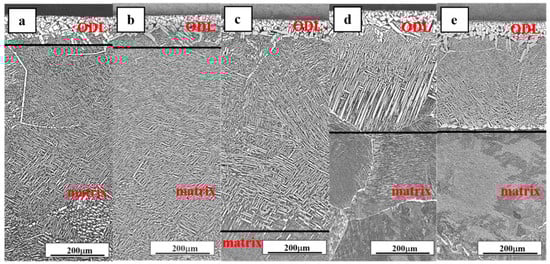 Figure 2 shows the cross-section morphology of TC21 alloy after oxygen uptake at different temperatures. It is observed that compared with the matrix, more equiaxed αp formed in the ODL. Moreover, it also presented that there is a clear boundary between the ODL and the matrix, indicating that the formation of ODL is related to the phase transition. Meanwhile, it was found that as the temperature of oxygen uptake increased, the ODL thickness also initially increased and then decreased. The maximum thickness of ODL was 760 μm, which can be obtained for the oxygen uptake temperature of 960 °C, as shown in Table 2 and Figure 3. It is worth noting that when the oxygen uptake temperature exceeded the Tβ, obvious stratifications, composed of equiaxed ODL of the outermost layer and lamellar ODL of the subsurface layer appeared. The interface between layer A and layer B is parallel to the initial surface of the isothermal treated specimens, revealing that the diffusion direction (or the concentration gradient) of oxygen plays a dominant role in the formation of layer A. Figure 4 illustrates the SEM morphology of the ODL and the matrix of TC21 alloy with a lamellar microstructure at different temperatures. Results show more αs precipitations in the ODL, indicating that the presence of oxygen enhances the precipitation of αs.
