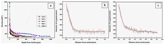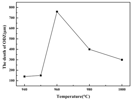 Figure 9 shows the variation of cross-section hardness and oxygen distribution on the sample from the surface to the matrix. Figure 9a presents ODL thicknesses of 150, 170, 740, 390, and 320 μm through hardness distribution after oxygen uptake under 940, 950, 960, 980, and 1000 °C, respectively. It is found that ODL thickness and metallographic observations have the same trend. Meanwhile, hardness values gradually decreases from the surface into the matrix, and the hardness of surface is much higher than that of the matrix. Moreover, according to Figure 9b,c, it is clearly observed that the diffusion length of oxygen exceeds 700 μm when the oxygen uptake temperature is 960 °C, but the diffusion length of oxygen is less than 200 μm at 950 °C. The hardness variation along the depth is closely correlated to the distribution of the oxygen concentration. The linear correlation between hardness and in titanium alloys has been verified []. Figure 10 indicates it was obvious that the volume fraction of recrystallization in the ODL is much higher than that of the matrix, which mainly originates from the decrease of substructure.