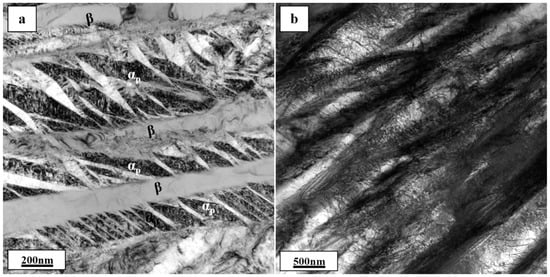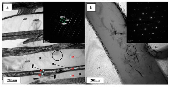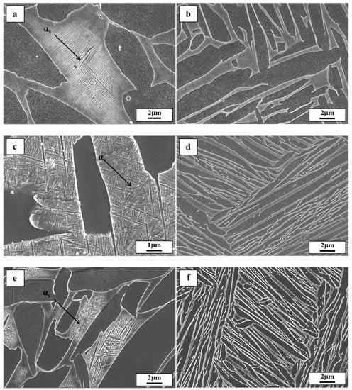 In this regard, it was demonstrated that the presence of oxygen consistently enhances the precipitation of αs []. Moreover, it was found that oxygen diffuses faster by a few orders of magnitude than the self-diffusion of Ti in both α-Ti and β-Ti alloys []. Accordingly, the introduction of a fast diffuser enhances the self-diffusion of the base atoms []. Therefore, the improved self-diffusion kinetics of Ti atoms increases the precipitation of αs []. Accordingly, the precipitation of acicular nano-scale αs may be attributed to the presence of oxygen.