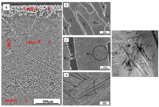 Figure 6 shows that there is a grain boundary (GB) α-β-α-layered structure in layer A, while there is no similar phenomenon in Layer B. It is inferred that the formation of GB α–β–α-layered structure is closely related to the oxygen content. Figure 7 illustrates the variation of chemical composition in the layered structure. It is observed that oxygen is present in the αp, while the oxygen content in the β phases is almost negligible. It is worth noting that oxygen is one of the α-stabilizing elements, and the solid solubility of oxygen in the α phase is much larger than that of the β phase.