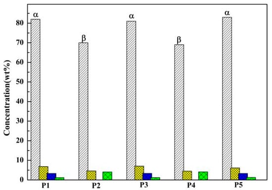 Variations of the chemical composition across the layered structure (five analyzing points, called P1, P2, P3, P4 and P5, are defined in Figure 6) showing that the α phase contains a high level of oxygen while the β phase contains a low level of oxygen (white—Ti, yellow—Al, blue—O, and green—Nb).