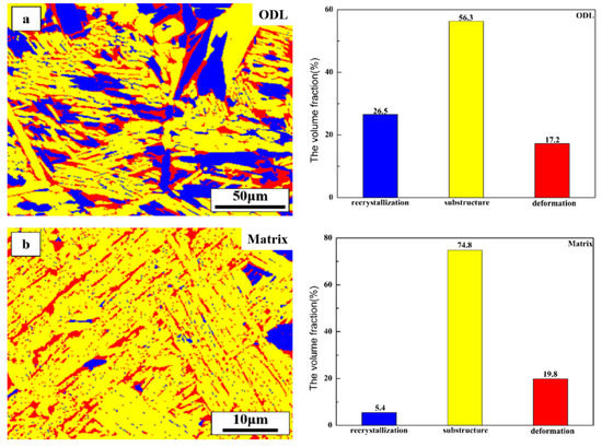 Recrystallization behavior of (a) ODL and (b) the matrix after oxygen uptake at 960 °C.