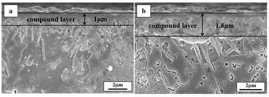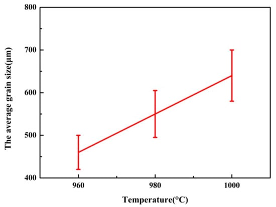 Based on the Arrhenius equation (i.e., D = D0 exp(−Q/RT)), the higher the temperature, the greater the diffusion coefficient, and consequently the deeper the ODL thickness. However, when the oxygen uptake temperature of TC21 alloy with a lamellar microstructure exceeds Tβ, as the temperature increases, the thickness of ODL gradually decreases. This is a completely abnormal phenomenon. This phenomenon can be physically interpreted as follows: firstly, as the temperature increases, the thickness of the compound layer gradually increases so that the oxygen ingress is inhibited. Figure 11 indicates that the thickness of the compound layer of TC21 alloy with a lamellar microstructure after oxygen uptake at 960 °C is 1 μm, while it is 1.8 μm at 1000 °C. Secondly, as the temperature increases, the incubation time of the compound decreases, thereby inhibiting the further ingress of oxygen []. Thirdly, as the temperature increases, the recrystallization decrease the density of dislocations. Consequently, oxygen diffusion depends more on the grain boundary. However, as the temperature increases, β grains rapidly grow, thereby reducing the grain boundary. In this regard, Figure 12 shows the β grain size against temperature. Accordingly, available channels for oxygen diffusion reduce.