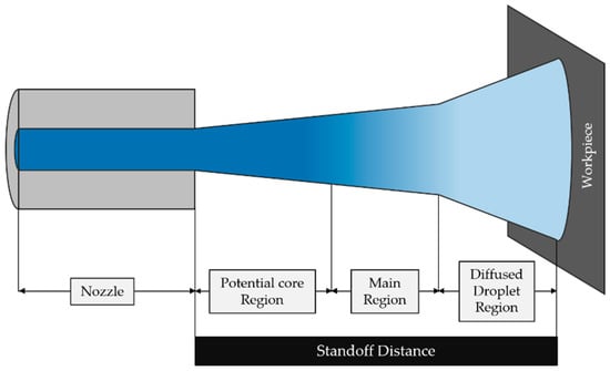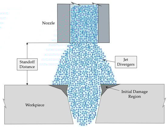 Finally, when they are ejected by the nozzle, the jet expands freely in a divergent way, reducing its power density and thus the machining capability if the distance between the nozzle and the material is very high [