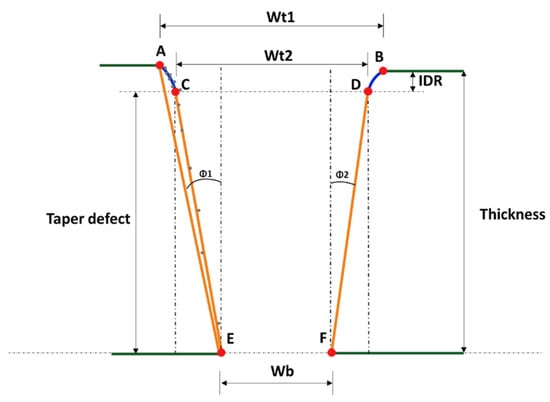 Another way to calculate the obtained geometry and its taper is through the taper angle. This is calculated through Equation (2), where