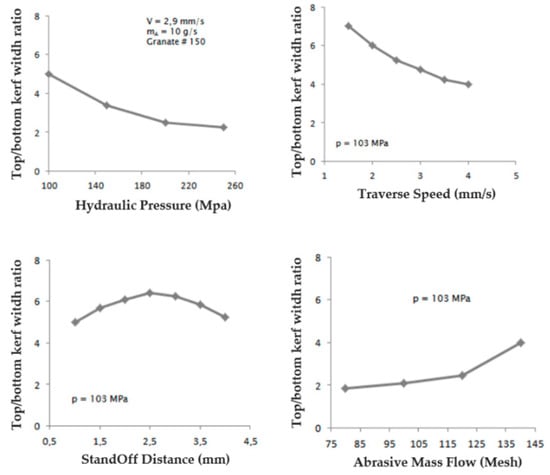As shown, the taper decreases significantly with an increase in pump pressure, as this increases the cutting energy. On the other hand, the influence of the traverse speed follows the same trend as the previous case: the taper increases with the increase in the traverse speed. Finally, an increase in the abrasive diameter reduces the formation of the taper due to the increase in the cutting capacity given to the water jet, minimizing the loss of kinetic energy [