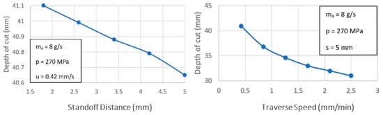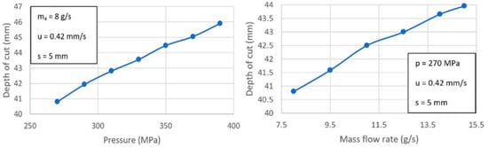 This difference in results may be due to the thickness of the machined material. In reduced thicknesses, close to 2 mm/min, a good surface quality can be achieved depending on the flow of abrasive particles. On the contrary, when the thickness of the material increases, close to 10 mm, the machining capacity generated by the hydraulic pressure seems to be more decisive. El-Hofy indicated that, as the hydraulic pressure increases, the kinetic energy of the water jet increases, reducing the delay generated by the high cross-feed and thus improving the quality of the final surface.