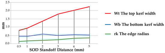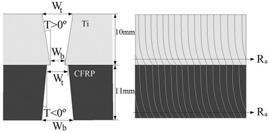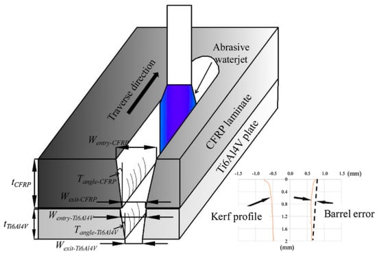 51] established results close to those previously commented. In their study, the authors mechanized, by abrasive water jet, a hybrid CFRP/Ti6Al4V structure in its two possible stacking configurations. In this study, as mentioned at the beginning of the section on water-jet cutting, it was identified that the erosion zone at the entrance of the material can distort the taper angle measured with traditional methodologies, establishing an error bar in their results in order to identify how far this linear regression is away from the actual curvature generated by the water-jet entrance (