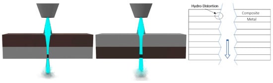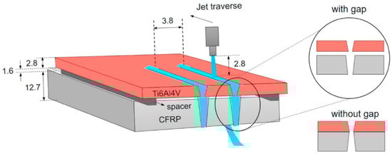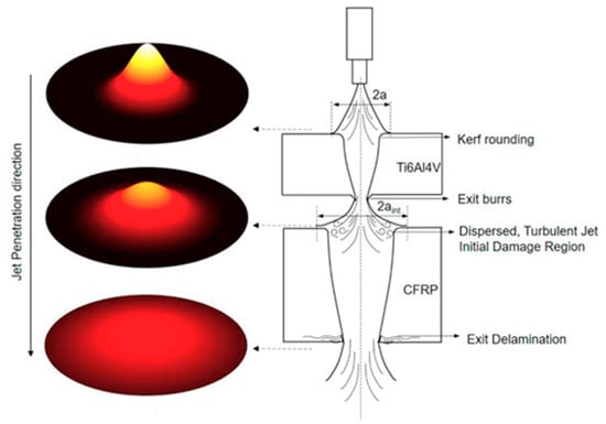 14] studied the machining of a hybrid CFRP/Ti6Al4V structure in a special configuration—both materials being separated by small gauges that allowed the water jet to exit freely from the first material and prevent damage to the interlayer of both materials (