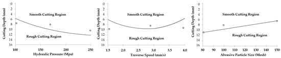 62] carried out an experimental investigation on abrasive water-jet machining on a 40 mm thick stainless steel through a response surface methodology, studying the influence of hydraulic pressure, traverse speed and abrasive grain size on surface quality through ANOVA statistical analysis. This analysis showed that a combination of the highest level of hydraulic pressure (3000 bar) with a small abrasive size and the lowest level of traverse speed (30 mm/min) produces the best surface quality by obtaining minimum Ra values close to 2 µm.