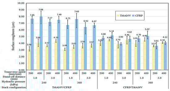 50] in the water-jet cutting of a hybrid CFRP/Ti6Al4V structure in both configurations. An ANOVA analysis corroborated the above, where the most influential factor in the surface quality of both materials is the traverse speed. However, the author highlighted that in the machining of a hybrid structure, the order of stacking before other parameters such as hydraulic pressure or abrasive mass flow has a greater influence on the surface quality obtained (