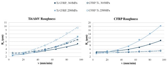 14] also explain the importance of traverse speed in water-jet machining of a hybrid CFRP/Ti structure. Here, by increasing the speed from 1 mm/min to 10 mm/min, the Ra values increase by 14% for the titanium alloy and 260% for the composite material (