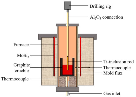 The experimental procedures can be described as follows. Firstly, 100 g of premelted mold flux sample was placed in a graphite crucible with an inner diameter of 40 mm and a length of 80 mm, then it was heated to 1623 K in an argon atmosphere (argon purity ≥99.999%). Secondly, when the temperature reached 1623 K, the premelted mold flux should be kept stable for 30 min to ensure uniform melting. The rod with Ti inclusions was preheated for 10 min above the mold flux surface, then immersed in the mold flux for 30 mm and rotated at a fixed speed of 200 rpm/min. At the end of the experiment, the rod with Ti inclusions was quickly withdrawn from the mold flux and cooled in air. The mold flux adhering to the side surface of the rod was removed with HCl dilute solution, as shown in Figure 2, and the rod diameter was measured by a micrometer to an accuracy of 0.02 mm. The morphology of the cross section was subjected to SEM observation with EDS analysis.