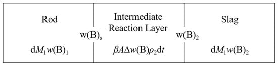 In the process of the rotational cylinder method, the rod (M1) was continuously dissolved in the slag, its internal component (B) formed an intermediate reaction layer in the surrounding dissolution process, and component (B) diffused into the slag again, as shown in Figure 3. In the process of rod dissolution, the mass of component dissolved in the rod () was equal to the sum of the mass formed by the intermediate reaction layer () and the mass of the component entering the slag () [16]:
