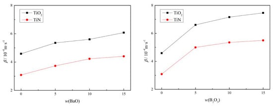 According to Equation (5), the mass transfer coefficients of TiO2 and TiN are calculated as shown in Figure 4. With the addition of BaO in the mold flux, the mass transfer coefficient of TiO2 increased from 4.58 × 10−4 m/s to 6.08 × 10−4 m/s, and the mass transfer coefficient increased by 32.7%. The mass transfer coefficient of TiN increased from 3.09 × 10−4 m/s to 4.41 × 10−4 m/s, and the mass transfer coefficient increased by 42.7%. With the addition of B2O3 in the mold flux, the mass transfer coefficient of TiO2 increased from 4.58 × 10−4 m/s to 7.46 × 10−4 m/s, and the mass transfer coefficient increased by 62.9%. The mass transfer coefficient of TiN increased from 3.09 × 10−4 m/s to 5.50 × 10−4 m/s, and the mass transfer coefficient increased by 78.0%.