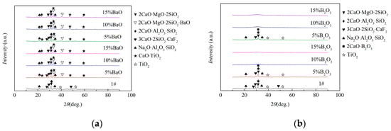 XRD analyses were carried out on the mold flux after adsorbing Ti inclusions, and the results are shown in Figure 5. As shown in Figure 5a, when mold fluxes containing BaO absorb Ti inclusions, the corresponding phase is CaTiO3. The peak value of 2CaO·MgO·2SiO2 is decreased and the peak value of BaO·2CaO·MgO·2SiO2 increased. With the addition of BaO in the mold flux, BaO combined with 2CaO·MgO·2SiO2 to form BaO·2CaO·MgO·2SiO2. As shown in Figure 5b, with the addition of B2O3 in the mold flux, the properties of the mold fluxes changed greatly. When the content of B2O3 in the mold flux increases to 10%, 6# and 7# mold fluxes change from crystalline to glass. This is due to the combination of B2O3 and CaO to form a large amount of 2CaO·B2O3 with a low melting point, which promotes the vitrification of the mold flux and reduces the viscosity of the mold flux. The addition of B2O3 to the mold flux reduces the activity of CaO and inhibits the binding ability of CaO and TiO2. Therefore, when mold fluxes containing B2O3 absorb TiO2 and TiN, the corresponding phase is still TiO2.