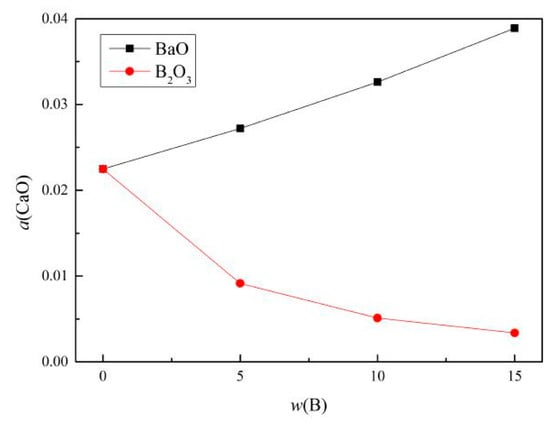 Similarly, the a(CaO) of the mold flux containing B2O3 was calculated, and activity of CaO in different mold fluxes is shown in Figure 6. The activity of CaO in the mold flux containing B2O3 decreased from 0.022 to 0.003.
