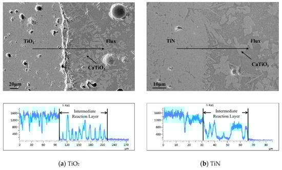 Through line scanning Ti element, it is determined that there is an intermediate reaction layer between the mold flux and the rod in the process of absorbing inclusions by the mold flux (2#), as shown in Figure 7. According to EDS analysis of absorbing Ti inclusions by the mold flux (2#), the main phase is CaTiO3, as shown in Table 4. Under the same conditions, the thickness of the intermediate reaction layer for absorbing TiO2 is about 120 μm, and that for absorbing TiN is about 35 μm, which indicates that the mass transfer coefficient of TiO2 to the mold flux is greater than that of TiN. This is due to the reaction of TiN and O2 to produce N2, which takes away heat, reduces local temperature, increases viscosity, and slows down the mass transfer process, as shown in Equation (16) [22].
