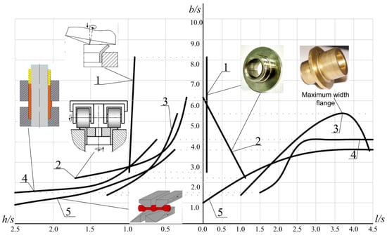 Technological capabilities of the process of the cold metal forming of parts with flanges: 1—a curve limiting the area of the axial rotary forging the flanging scheme; 2—a curve limiting the area of rolling according to the scheme of rotary forging; 3—a curve limiting the area of rolling according to the scheme of angular rolling; 4—a curve limiting the area of manufacturing flange parts according to the radial extrusion scheme; and 5—a curve limiting the area of flange parts production according to the cross wedge rolling scheme.