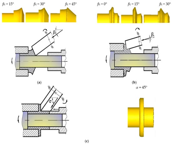 In the second stage (Figure 5b) the position of the roll is changed to an angle β2 equal to 15°, and the preformed flange is formed. At angles β2 of less than 10°, the metal flows preferentially in the radial direction. At angles β2 greater than 20°, flanges are not formed at full volume in the third stage of rolling, due to the active flow of metal in the axial direction. At the third (final) stage, the contour of the flange part is formed by selecting the geometry of the rolling roll at an angle α to the axis of the workpiece, equal to 45° (Figure 5c). At angles of dip of the rolling roll equivalent to α, less than 40° of the sleeve part of the detail will remain unformed. At angles of dip α over 70°, flanges are not formed in full profile.