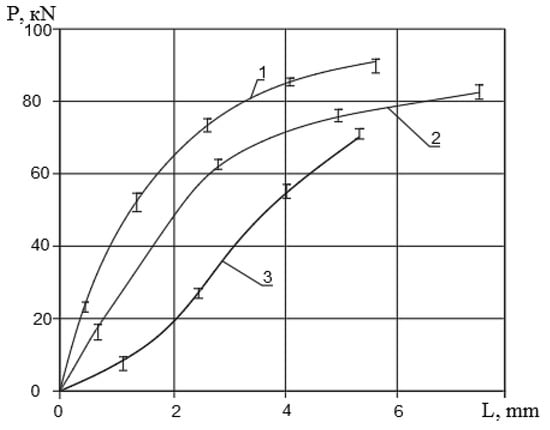 The energy-power parameters of the process were measured on the experimental stand. Measurement results were recorded on a H115 light-beam oscilloscope with a TA-5 amplifying strain gauge. Resistance sensors are assembled according to a half-bridge circuit. The ring mesdose was calibrated with a reference dynamometer of DS-150 kN. The dependences of deformation forces P on the movement of the roll at the three stages of flange rolling are shown in Figure 9, where the maximum roll force is 92 kN. The deformation force did not exceed the nominal force of the experimental stand—150 kN. Figure 9 shows the experimental curves of the deformation force of the workpiece at three stages: 1—at the third stage of part rolling; 2—at the second stage of part rolling; 3—at the first stage of part rolling.