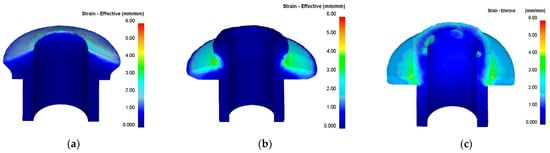 According to the results of the computer simulation of the rolling process, analysis was made of the effective strain values in the workpiece for all three stages (Figure 10) [24]. The highest value of effective strain is observed in the hollow of the flange in the second and third stages (up to 3.7). In this zone, the stress state is close to the state of non-uniform all-round compression, and therefore, discontinuity of the metal in this zone is unlikely. A relatively small effective deformation is observed near the lower base of the formed truncated cone in the first stage, as well as in the upper part of the flange after the third stage. In these zones, predominantly tensile stresses act, which can lead to the appearance of defects [25] in the form of cracks if we continue the process of rolling.