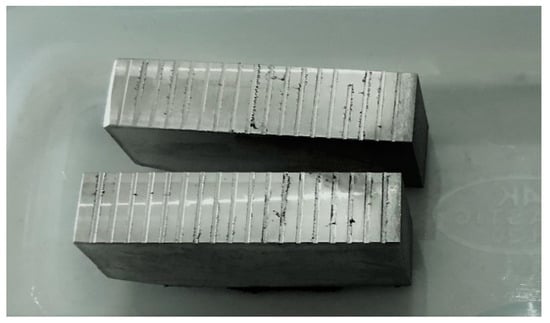 The dimension of the workpiece that was mounted on the fixture was 10 mm × 50 mm × 20 mm, which was prepared using Electric Discharge Machining (EDM). The cutting length of these slots for the experimentations was fixed at 10 mm, so the wear and damage to the tool can be neglected. Each slot was 2 mm apart, as shown in Figure 1.
