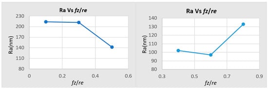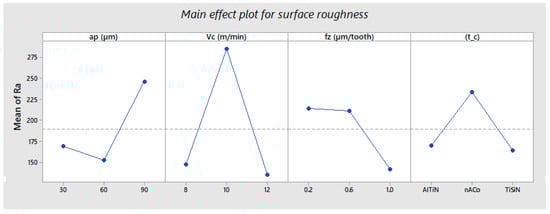 It was concluded from the main effect plot that the surface roughness increased with the increase in cutting speed from 8 to 10 m/min and then decreased from 10 to 12 m/min. It was also observed from the literature that the surface roughness decreased from 10 to 25 m/min [81]. From the given results, it was also determined that the surface roughness decreased with a ratio of undeformed chip thickness (fz) to -cutting-edge radius (re) (fz/re) of 0.3 to 0.5, as reported in the literature, compared to the results shown in Figure 5 [81].
