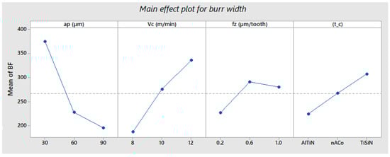 Figure 6 shows the main effect plot for burr width, it can be seen that AlTiN coated tools showed the best performances for the burr formation during micromachining of Inconel 718 for the cutting length of 10 mm. nACo coated tools showed higher burr values than AlTiN coated tools and less than TiSiN coated tools. The TiSiN coated tool showed higher values for burr formation due to the larger cutting-edge radius compared to the other tools, which indicates that cutting-edge radius is a significant cutting parameter in the micromilling process. Due to the larger cutting-edge radius, most of the cutting was below the minimum chip thickness which increased the cutting forces and deformation during the machining process and, therefore, resulted in a larger burr width.