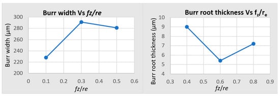 It was observed that as the feed to cutting-edge radius values increased from 0.3 to 0.5, the burr width decreased. The same trend was observed for burr root thickness during micromachining of Inconel 718 in a previous study, as shown in Figure 7 [81].