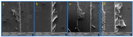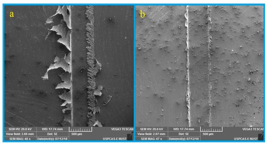 There are different locations at which burr can form such as a top burr, exit burr, entrance burr, and bottom burr. In the current experimentations, during the burr analysis, the focus was given to the top burr width and was measured using a scanning electron microscope (TESCAN VEGA3, kohoutovice, Czech Republic) at different magnifications according to the width of the burr. During burr formation analysis, maximum burr width was measured for each slot as shown in Figure 3.