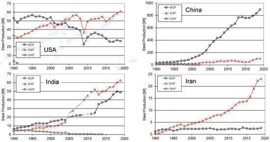 Four examples of electric arc furnace (EAF) steel production on different levels in the global steel industry (basic oxygen furnace, BOF; open hearth furnace, OHF); data from World Steel Association [1].