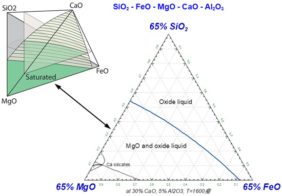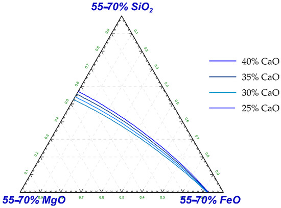 The saturation surface of MgO was calculated using the Factsage database in the system CaO–MgO–FeO–SiO2–Al2O3 at 1600 °C and constant 5% Al2O3 for EAF slags (Figure 2), thus neglecting the minor TiO2 and Cr2O3 slag components in carbon steelmaking slags. MnO [33] was also neglected here, suggesting the addition of a low amount of MnO to FeO when required for higher precision. The pseudo-ternary diagram in Figure 2 represents a slide section in the five-component space CaO–MgO–FeO–SiO2–Al2O3 at 30% CaO and 5% Al2O3. The chosen section is best suited to investigating the MgO saturation status of EAF slags for low-alloyed steel grades because (1) the MgO saturation field is represented to a maximum extent and (2) the calculated saturation lines are derived at compositions close to the slag data, in contrast to other MgO saturation figures (e.g., [4,5]).