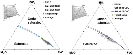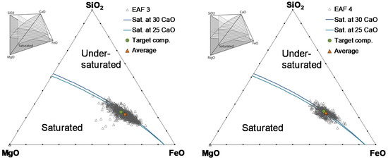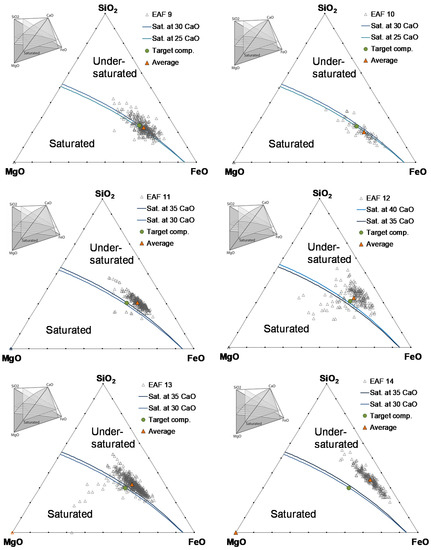 The desired MgO saturation levels (the proposed “target” composition in Figure 4, Figure 5 and Figure 6) are defined with respect to particular EAFs and steel plant conditions, i.e., depending on the particular FeO levels and available raw materials. In the proposed representation of the MgO saturation surface, the MgO saturation conditions were investigated and defined independently from standard basicity concepts for EAF steelmaking. This might be of interest when considering EAF process slags in other oxide systems, e.g., for Cr stainless steelmaking or non-ferrous metal production.