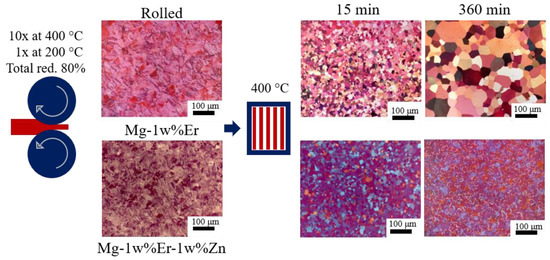 Micrographs of Mg-1%Er and Mg-1%Er-1%Zn in the as-rolled state and upon annealing at 400 °C for 15 and 360 min. The images are taken from the rolling plane (mid-thickness).