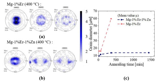 During a subsequent heat treatment at 400 °C, the ternary alloy seemed to develop a fine-grained annealing microstructure with a stable grain size (14 µm) that was not liable to additional grain growth at increased annealing durations (Figure 2). The corresponding annealing texture witnessed a unique transition demonstrated by new off-basal components appearing at ±40° TD. This type of annealing texture after rolling is only common for hcp metals like titanium [16], that have a lower c/a ratio than the ideal ratio of 1.633 for close-packed structures, and can thus easily activate prismatic and pyramidal slip. As to the binary alloy, it exhibited an initially stable grain size (16 µm) up to an annealing time of 60 min but underwent significant grain growth (60 µm) after 360 min of annealing (Figure 3c). The texture of the binary Mg-1%Er alloy during early annealing conserved the dominant pole split in RD seen in the deformation texture but was also significantly weakened as a result of recrystallization (5.6 MRD 2.3 MRD). With prolonged annealing up to 360 min, the texture spread around the normal direction ND seemed to increase during grain growth and the basal component in the center of the pole figure has vanished.