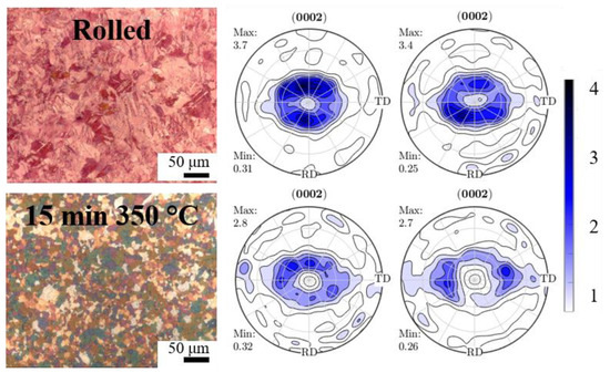 Figure 2 shows the optical microstructures of rolled and annealed samples of the binary and ternary Mg-1%Er-(1%Zn) alloys. The annealing temperature was 400 °C and the annealing times were 15 and 360 min, respectively. The corresponding XRD textures, presented in terms of (0002) pole figures, as well as the evolution of the average grain size as a function of the annealing time are given in Figure 3. As it can be seen, both alloys exhibited a common deformation microstructure characterized by deformed grains and numerous deformation twins. The rolling texture of the binary alloy showed a typical basal component with a pole spread towards the rolling direction (RD) and moderate intensity. On the other hand, the ternary alloy exhibited a weaker and much softer rolling texture characterized by two off-basal components at ±20° RD that bare a significant pole spread in the transverse direction TD.