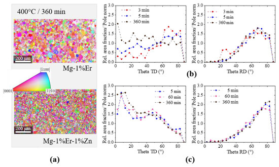 (a) EBSD ND-IPF maps of binary (top) and ternary Mg-1%Er-(1%Zn) (bottom) alloys annealed at 400 °C for 360 min; (b,c) angle distribution profiles between the c-axis and the transverse and rolling directions for different annealing durations.