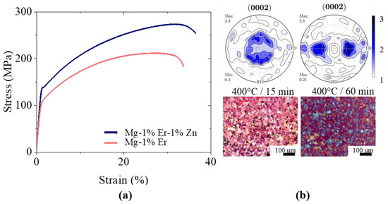Uniaxial stress–strain response (a), optical micrographs and (0002) pole figures of Mg-1%Er annealed for 15 min and Mg-1%Er-1%Zn annealed for 60 min at 400 °C (b). The grain size prior to the tensile test was in the range of 14 to 16 µm for both samples.