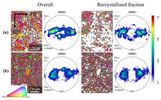In the ternary alloy, the process of recrystallization was responsible for the RD TD transition of the basal pole spread seen in Figure 4, which can be contributed to either oriented nucleation or selective nucleus growth. Selective growth of texture components can be caused by anisotropic segregation behavior and/or an equalization of different grain boundary mobilities annihilating a prior growth advantage of certain orientations, e.g., of basal oriented grains as suggested by Barrett et al. [25]. Figure 9 presents EBSD maps (ND-IPF) of the microstructure of the ternary alloy at 5 and 10 min annealing at 350 °C. The orientation of recrystallized grains was evaluated separately from the orientation of the overall microstructure in order to discern the effect of recrystallization on the development of the ±40° TD texture. For this, the common criterion of grain orientation spread (GOS) was used, where recrystallized grains typically depicted GOS < 1°. The overall texture revealed that the RD-tilted components were a feature of the deformation microstructure. They did not exist in the recrystallization texture that was solely composed of the TD-tilted components, readily after 5 min of annealing (Figure 9a). After completion of recrystallization at 10 min of annealing, the RD-tilted components were no longer a feature of the overall texture that was only dictated by the TD- recrystallization texture (cf. Figure 9b).