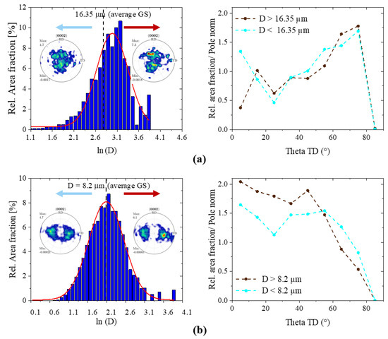 Grain size distributions from EBSD measurements of Mg-1%Er annealed at 400 °C for 4 min (a) and Mg-1%Er-1%Zn annealed at 350 °C for 10 min (b) along with the orientation distribution of the c-axis with respect to TD for small and large recrystallized grains. The threshold used in each case was the average grain size obtained from EBSD.