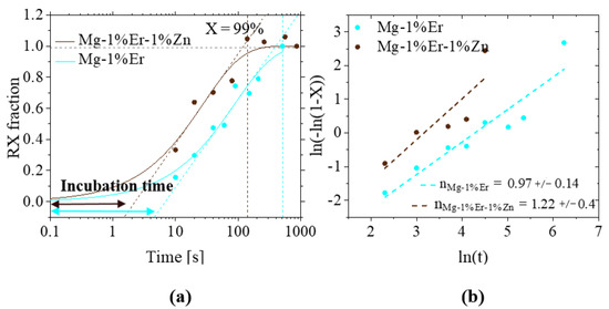 (a) Recrystallization kinetics of binary and ternary Mg-1%Er-(1%Zn) annealed at 350 °C and the corresponding Avrami exponents (b).