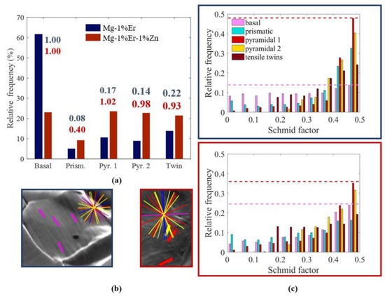 Figure 12 also shows the distribution of Schmid factors (SF) of both alloys with respect to the applied external stress corresponding to different slip traces detected. Generally, non-basal slip (particularly pyramidal) seems to be the main plasticity carrier in both alloys. It also seems to comply principally well with the Schmid law, i.e., corresponding slip traces are preferentially detected in grains with the highest SF, and their frequency drops consecutively with decreasing SF. In the binary alloy, it is evident that the activation of basal slip in grains with a very low SF deviates from the Schmid behavior. This is likely due to the naturally low CRSS of basal slip but also to local stress concentrations at grain boundaries that could cause non-Schmid activation of different slip modes. Another important finding from the SF distribution in Figure 12 is the large difference in the contribution of basal vs. non-basal slip to deformation between the two alloys. In the Mg-Er sample at SF = 0.5, non-basal slip (including prismatic and both <a> and <c + a> pyramidal slip) was ~2–3 times more active than basal slip. In contrast, the level of contribution of these slip modes to deformation at SF = 0.5 in the Mg-1%Er-1%Zn sample was more comparable. Both types of pyramidal slip were still preferential with a frequency ratio of ~1.2–1.5 to basal slip. Prismatic slip was no longer favorable compared to basal slip (frequency ratio of ~0.7).