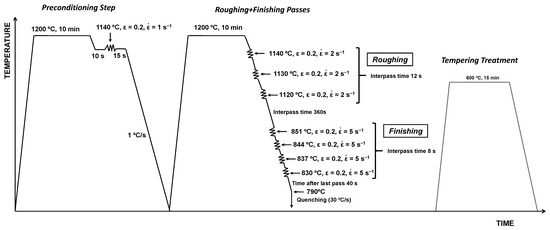 Plane strain compression tests were performed in order to simulate the direct quenching and tempering treatments (see the thermomechanical schedule in Figure 1). For each chemistry, two laboratory tests were performed, one for simulating Q and another one for reproducing Q + T cycle. For that purpose, rectangular plane strain compression specimens were used (60 mm long, 30 mm wide, and 22 mm thick). Firstly, a preconditioning step consisting of soaking at 1200 °C for 10 min followed by a deformation pass (ε = 0.2 at 1 s−1) at 1140 °C was carried out to minimize the presence of coarse austenite grains. Afterwards, the samples were cooled down at a constant rate of 1 °C/s to room temperature. In a recently published work, and following the same hot working strategy, it was observed that the roughing and finishing passes were not able to refine the austenitic structure at reheating temperature [22]. Therefore, the preconditioning step was essential for ensuring a homogeneous and fine austenite prior to martensite transformation. Then, the plane compression specimens were reheated at 1200 °C for 10 min in order to ensure the dissolution of Nb in the CMnNbB and CMnNbMoB steels, followed by three roughing deformation passes (ε = 0.2 at 2 s−1) with an interpass time of 3 s at decreasing temperature in the 1140–1120 °C range. After a holding time of 360 s, the finishing passes were completed applying four deformation passes of 0.2 at 5 s−1 with an interpass time of 8 s in the 851 and 830 °C range. In order to simulate plate quenching conditions after the last deformation pass, an air–water mixture was employed. A cooling strategy of two steps was applied cooling down at 30 °C/s to 300 °C and then, at 10 °C/s down to room temperature. Finally, for the Q + T samples, a tempering treatment was performed at 600 °C for 15 min.