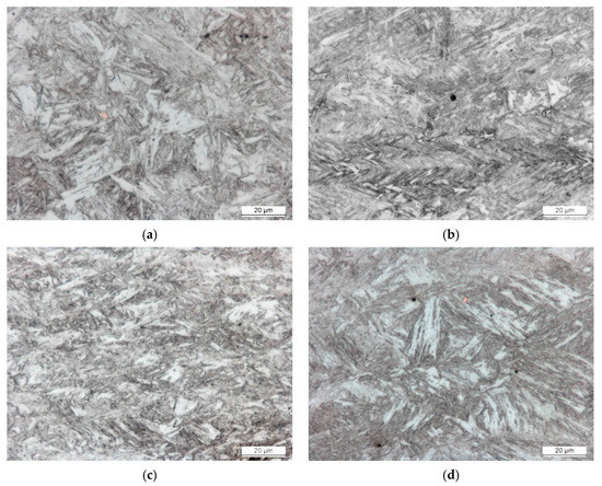 Optical micrographs after quenching (Q state) corresponding to (a) CMnB, (b) CMnNbB, (c) CMnMoB, and (d) CMnNnMoB steels.